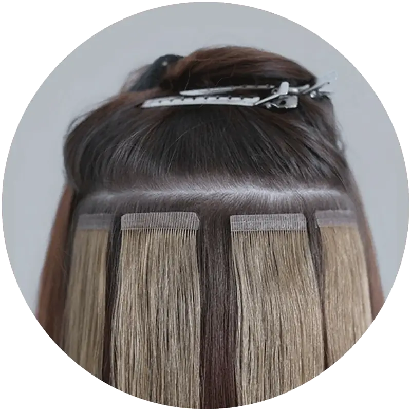 Tape-in hair extensions use thin, medical-grade adhesive wefts that sit flat against the scalp, making them almost invisible.